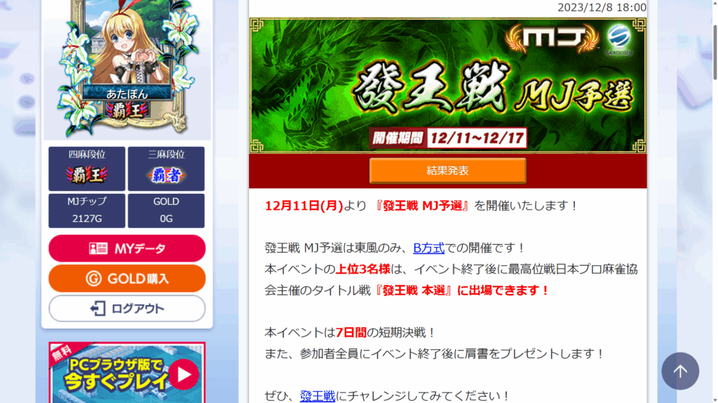 『セガネットワーク麻雀MJ』。かつてはプレイしていたネット麻雀だが、「第2回 まどかマギカCUP(2023年8月7日~8月27日開催)」でS賞を獲れなかったことをひとつの区切りとして、やめてしまっていた。S賞を狙いに行って獲れなかったことは残念だったが、やめるいい機会でもあったのだ。